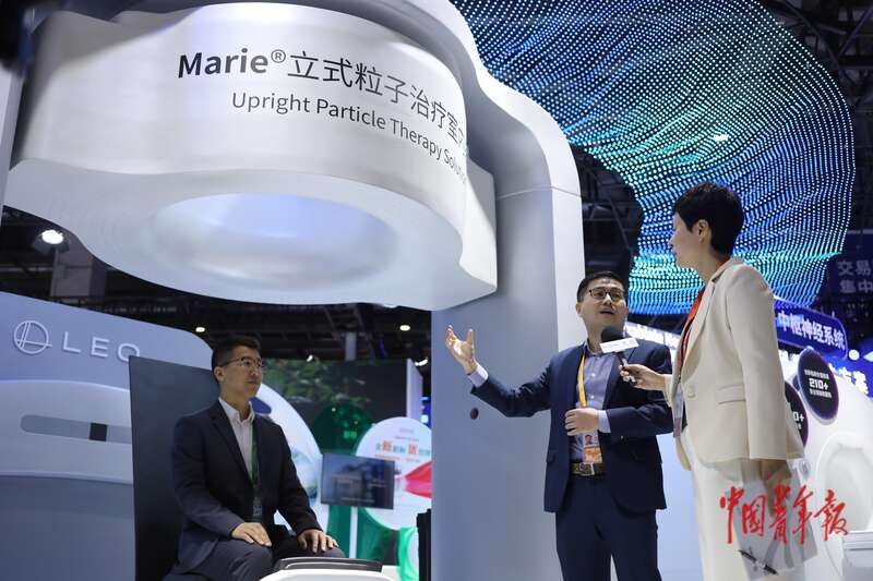 11月10日,上海国家会展中心,第八届中国国际进口博览会医疗器械及医疗保障展区,一名参展商在向参观者介绍一款用于肿瘤放疗的立式粒子治疗室内系统。中青报·中青网记者 孔斯琪/摄