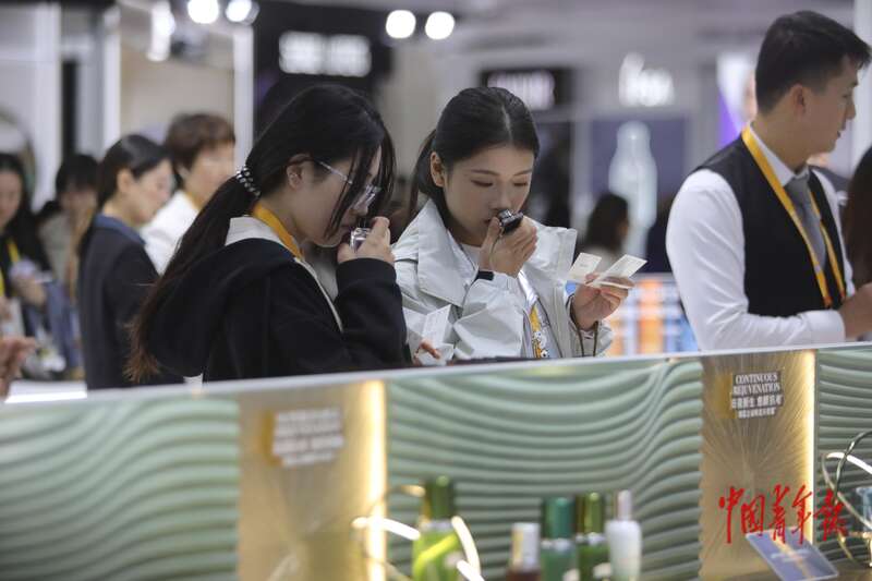 11月10日,上海国家会展中心,第八届中国国际进口博览会消费品展区,两名年轻人在试用美妆产品。中青报·中青网记者 孔斯琪/摄