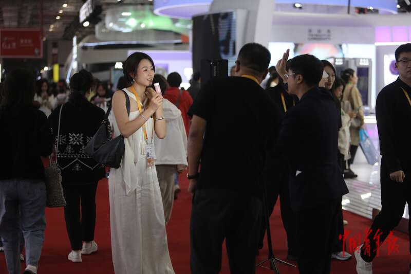 11月10日,上海国家会展中心,第八届中国国际进口博览会消费品展区,一名参展商在会场中现场直播带货。中青报·中青网记者 孔斯琪/摄